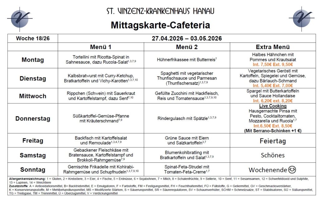 Wir bieten täglich zwei Hauptgerichte zur Auswahl (Preis für Gäste: 6,00 Euro) und ein Extramenü zum Tagespreis.